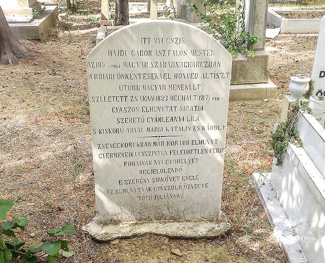 Sultan Abdulmejid opened a new cemetery for the Protestants in 1857, donating the territory in perpetuity to the Istanbul diplomatic corps of the Protestant countries. The owners of the territory are currently the United States, the United Kingdom, the Netherlands, Germany, Switzerland, Sweden and Hungary. The Hungarian parcel consists of around fifty tombs. At the end of the 1850s, tombs were also brought here from other sites. The tomb of Jakab Lagentali Lang Jakab (1663-1720), doctor of Francis II Rákóczi came here this way as well. A number of immigrants from the 1848-49 Hungarian Revolution are buried here, such as the Turkish interpreter of Lajos Kossut, Imre Csernátoni Cseh (1805-1882) and renown manuscript collector Dániel Szilágyi (1831-1885). The place still serves as the burial place for Hungarians of Istanbul. The Association for Hungarian-Turkish Friendship put a commemorative plate here in memory of the Hungarian Revolution in 1848-49 in 1990, adding a Zsolnay pyrogranite Kossuth coat of arms together with the Hungarian Academy for Sciences in 2001. The wall of the cemetery also features memorial plates of the participant of the 1956 Revolution, Marta Veronika Arbatlı and Turkologist Tímea Gál, who was born in Szombathely in 1968 and died at a young age in 2011.