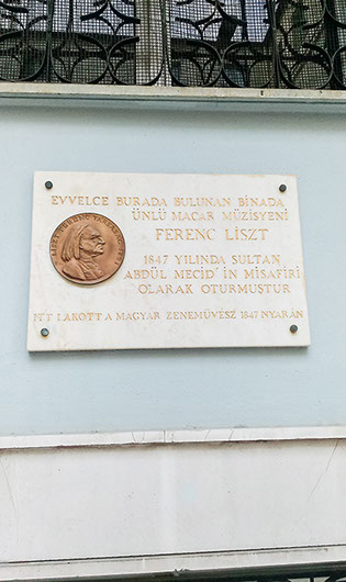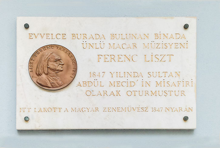 Ferenc Liszt, 8 Haziran 1847’de İstanbul’a gelmiş ve beş hafta geçirmiştir. İstanbul’da bir müzik dükkânı olan ve aynı zamanda piyano üreten Alexandre Kommendiger’in evinde kalmıştır. Sultan Abdülmecit’e İki defa konser vermiş ve kendisine sultan tarafından değerli hediyeler sunulmuştur. Liszt, biri açık hava konseri olmak üzere İstanbul’da pek çok konser vermiştir. Daha sonra da hayatının sonuna kadar Padişah ve İstanbul ile ilişkileri devam etmiştir. Ziyaretinde kaldığı evde olmamakla birlikte, sanatçı Miklós Borsos tarafından hazırlanan kitabe, ünlü müzisyenin o civarda geçirdiği günlerin anısına dikilmiştir.
